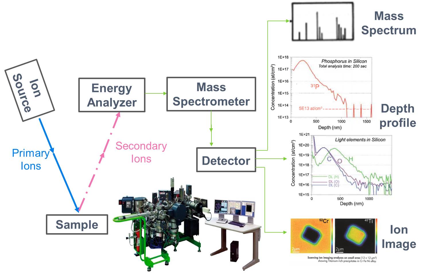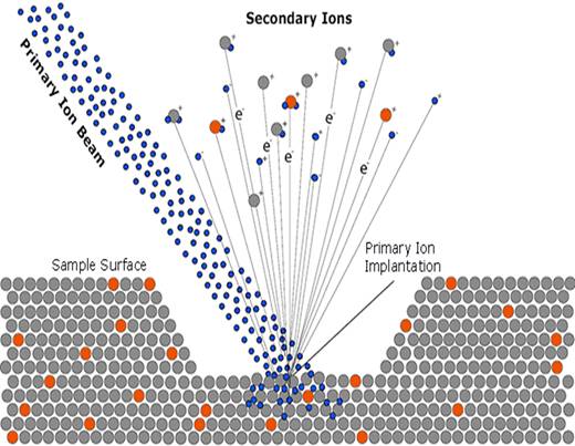 Secondary Ion Mass Spectrometry (SIMS) is based on the sputtering of solid sample surfaces by primary ion bombardment. Primary ions impinging on the sample surface trigger a cascade of atomic collisions. A portion of the single atoms and clusters ejected are spontaneously ionized. These secondary ions are characteristic of the composition of the analyzed area. They are separated according to their mass/charge ratio. Elemental mapping or depth profiles containing quantitative information can be obtained for a selected mass.