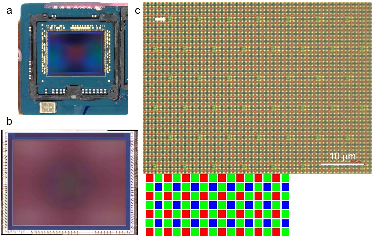 c shows high magnification 3D OM image at the center of the image sensor, clearly exhibits the RGB pixels arrangement.