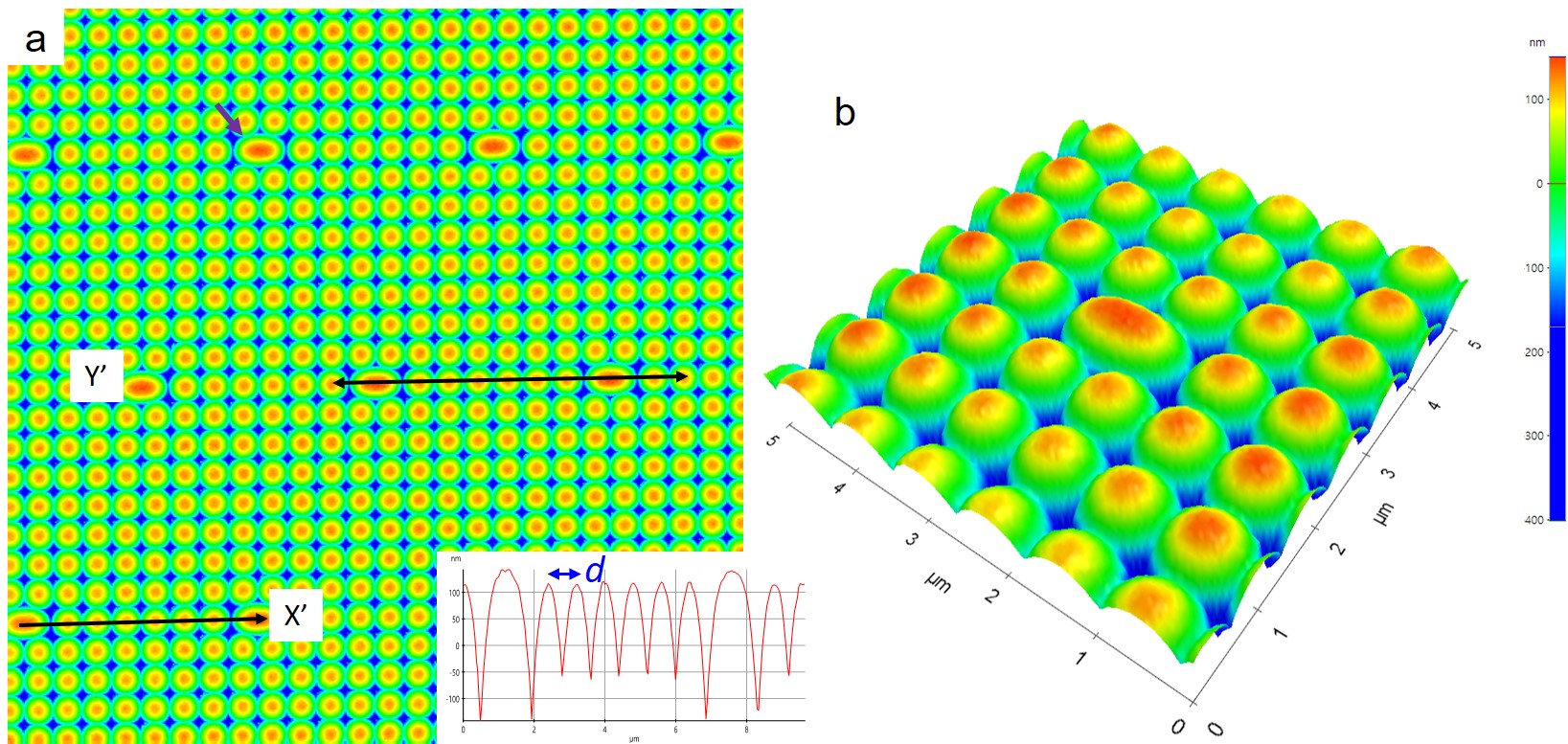 To unveil the surface morphology of the image sensor, microlens (ML), AFM is utilized as shown in a and the line profile along the black double arrow shown in the inset of a suggests the interspacing of the ML cell, d, is 0.8 m. A super PD is marked by the purple arrow.