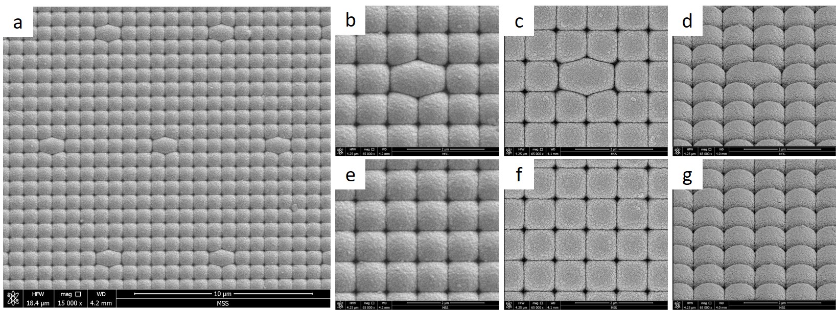 b-d and e-g are higher magnification SEM images of the ML cells taken with different imaging modes and viewpoints (tilted view).