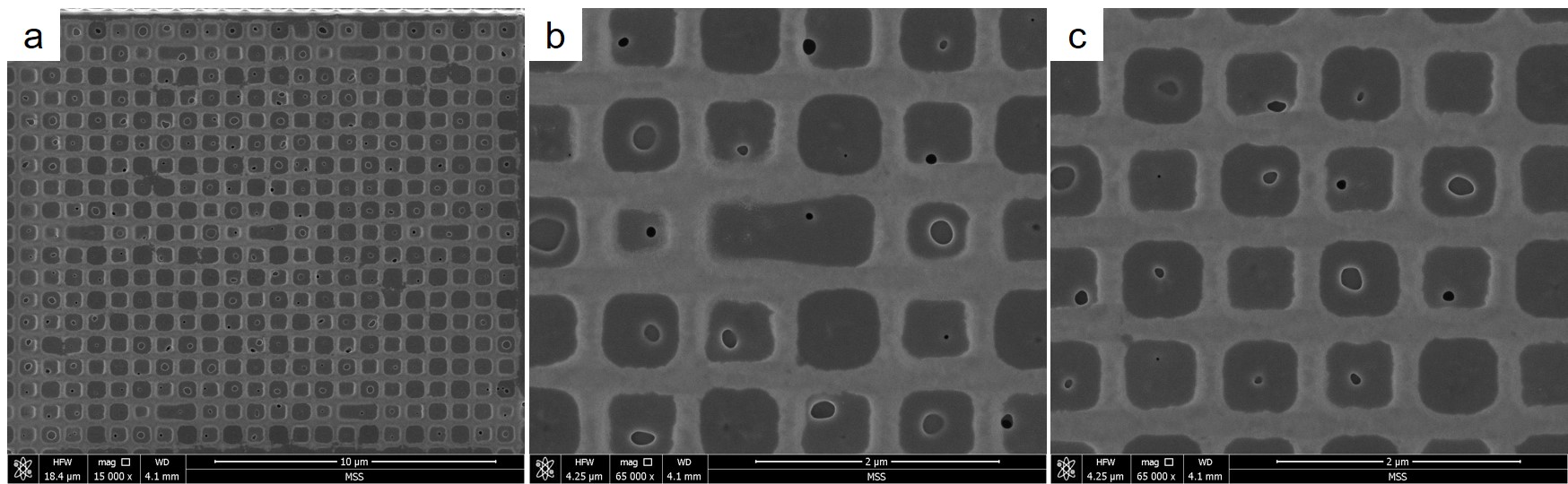a-c are SEM images of the Grid structure taken with different magnifications.