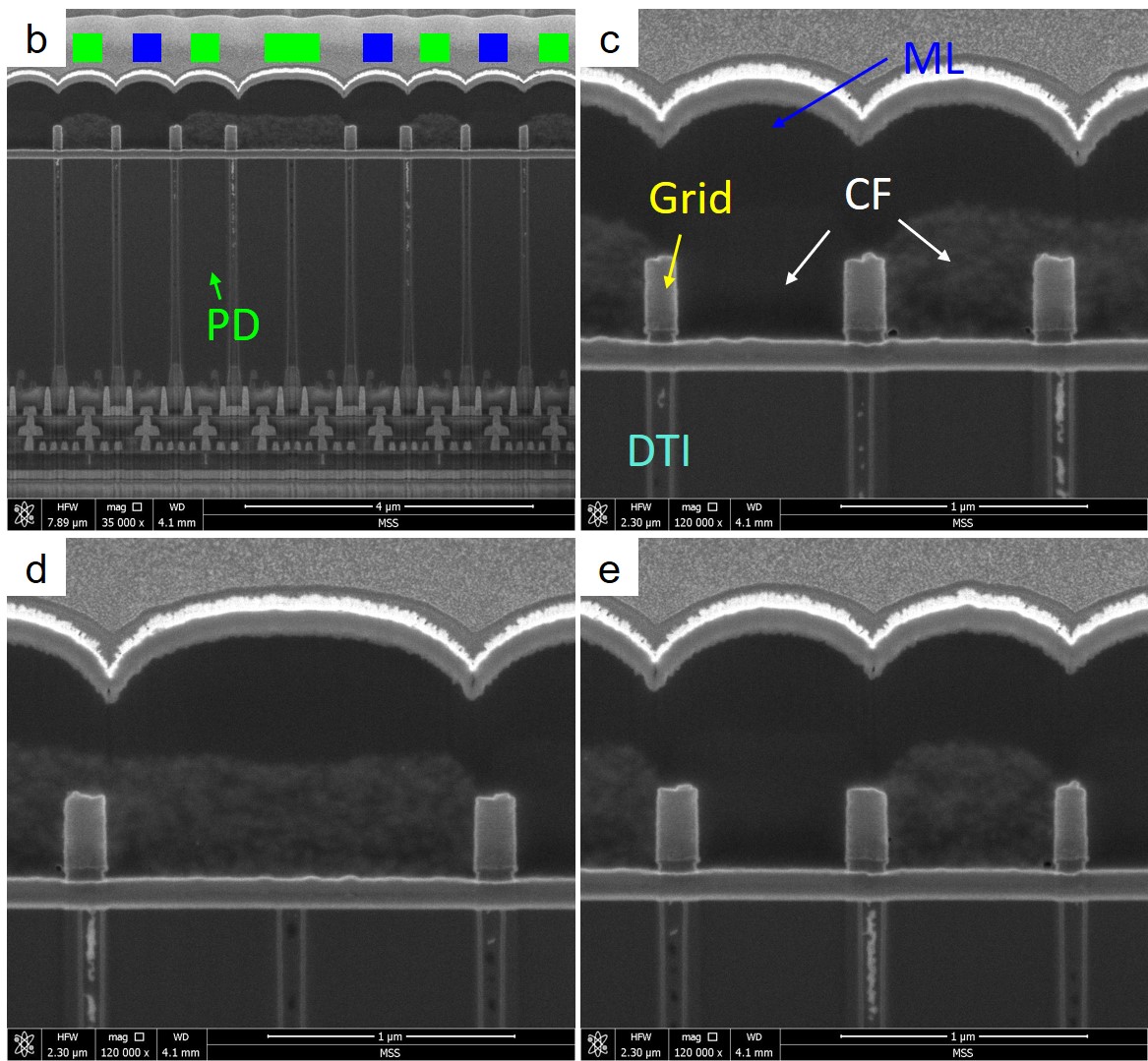 a shows cross-sectional overview SEM image of the image sensor, where each layer structure is identified.
