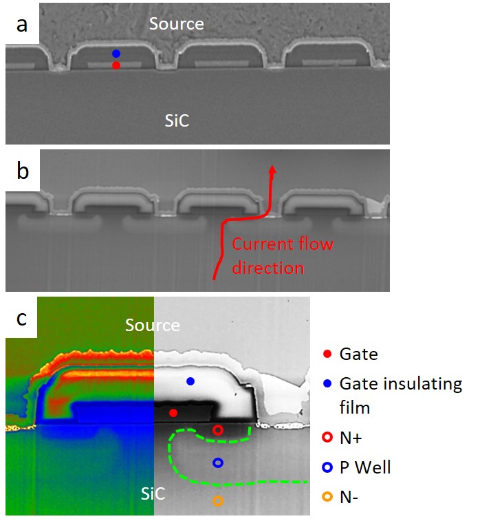 With the help of the color scale rendering, fine structures of the SiC MOSFET can be seen in the further zoom-in SEM image, c.