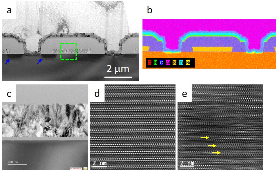 In contrast, another super high-resolution TEM image taken at the doping area is shown in e, where dislocations, line defects, can be observed, as marked by the yellow arrows.