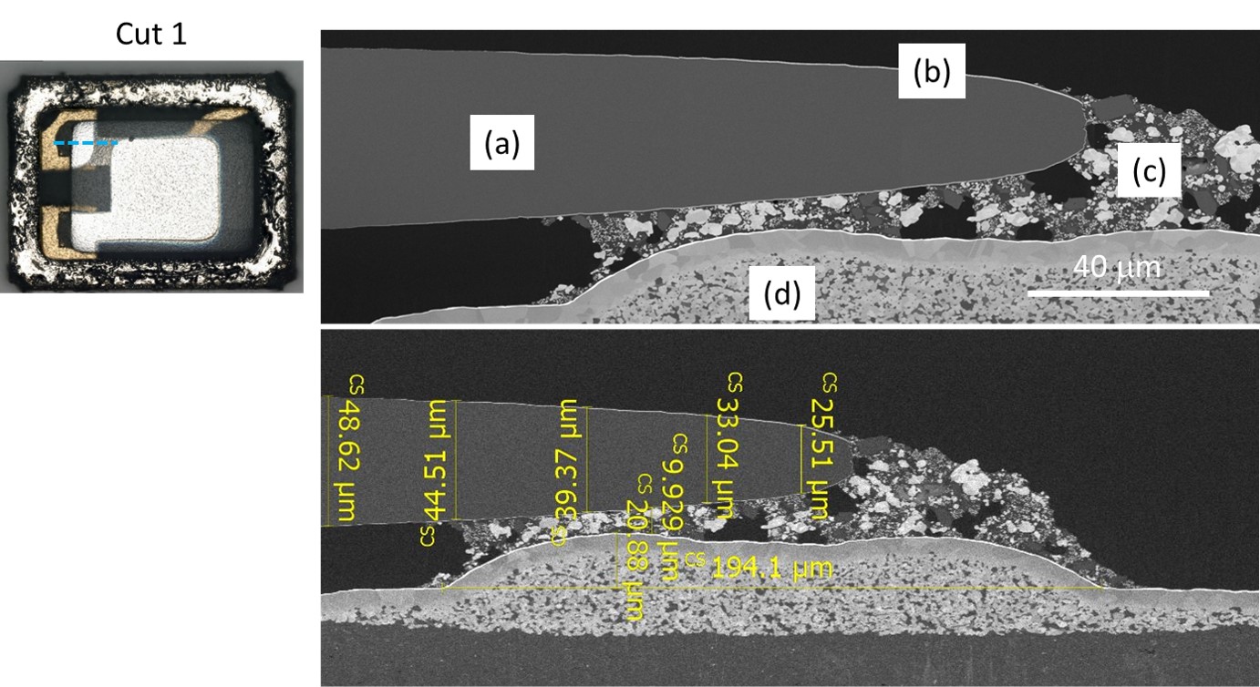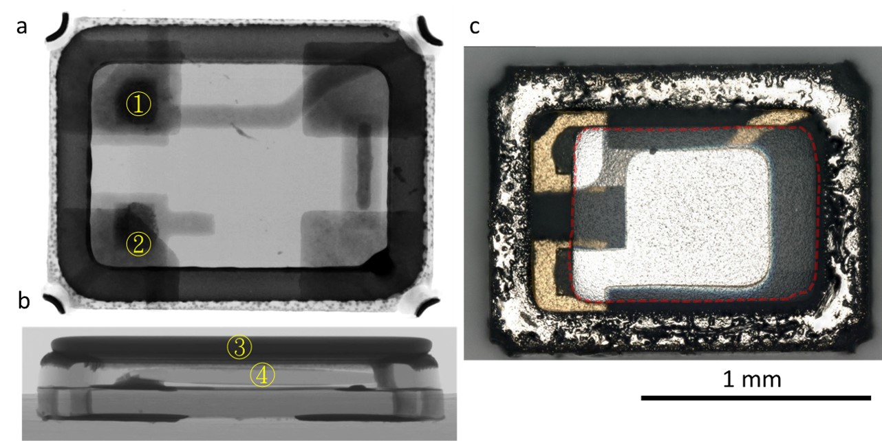 The upper-right image exhibits the PFIB results, where (a) is the quartz itself, (b) is the metal coating above the quartz, (c) is the silver glue, and (d) is the package substrate.