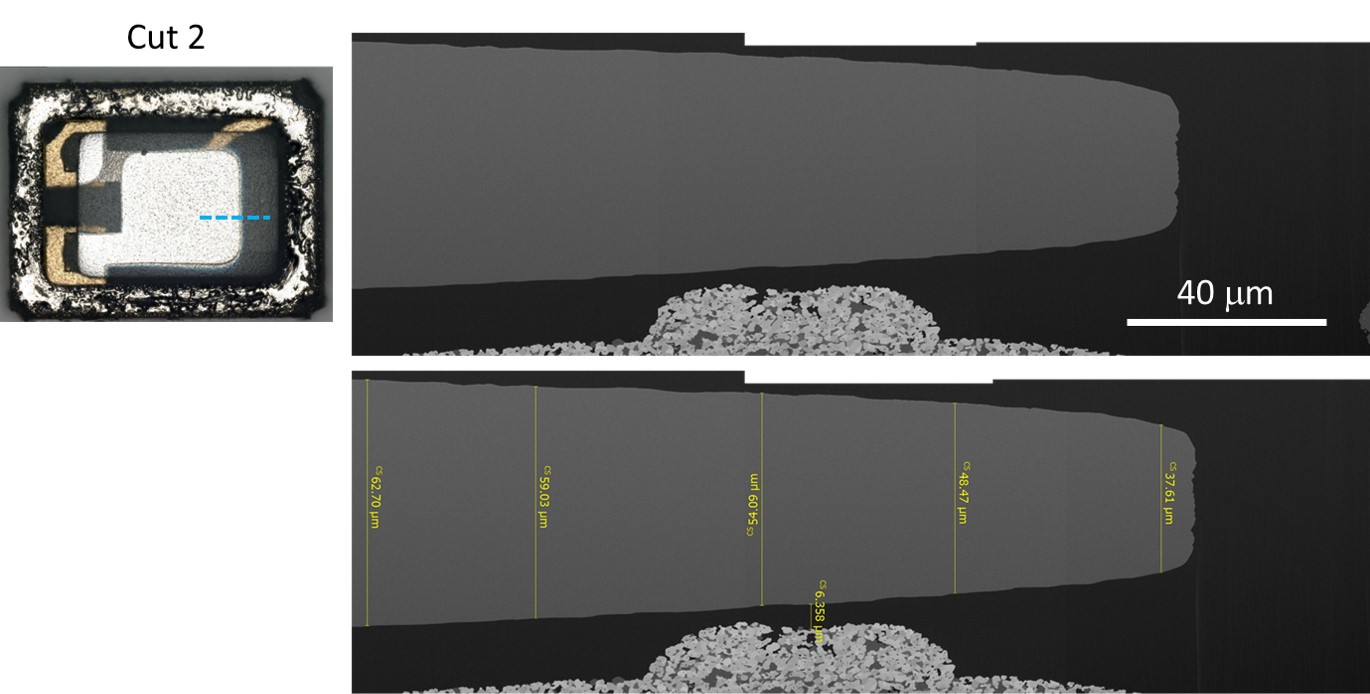Another cut, cut 2, exhibits the quartz in this location does not attach/glue to the electrode/substrate, the free-standing side.